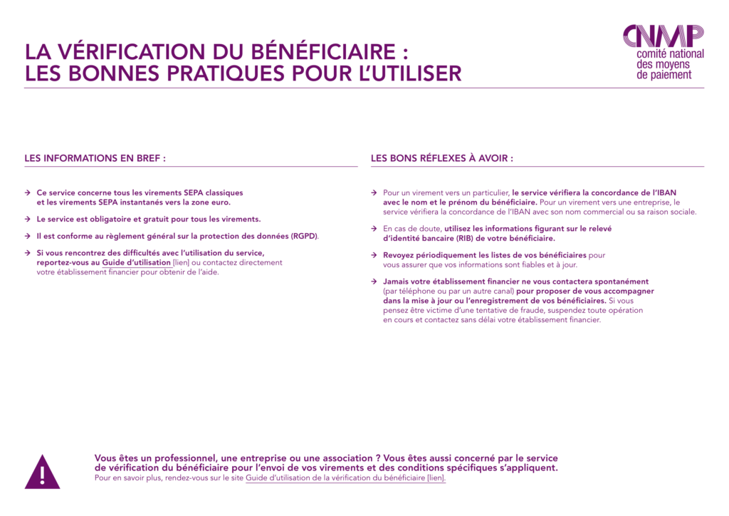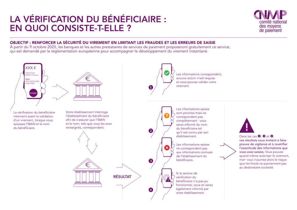 FAQ - Verification Of Payee À compter du 9 octobre 2025, la Vérification du bénéficiaire (VoP – Verification of Payee) deviendra obligatoire pour tous les virements SEPA, qu’ils soient classiques ou instantanés. Ce dispositif, gratuit pour les utilisateurs, vise à renforcer la sécurité des paiements en réduisant à la fois : les fraudes au virement (notamment les fraudes au faux RIB), les erreurs de saisie d’IBAN ou de nom du bénéficiaire. Concrètement, avant l’exécution d’un virement, l’établissement du payeur doit interroger l’établissement du bénéficiaire pour vérifier la concordance entre l’IBAN et le nom du titulaire du compte. En cas de discordance, une alerte est affichée au payeur, qui conserve la liberté de poursuivre ou non l’opération. Enjeux du dispositif Protection des utilisateurs : limiter les virements mal orientés ou frauduleux. Sécurité du système de paiement SEPA : accompagner le déploiement du virement instantané en Europe. Confiance des entreprises et des particuliers : améliorer la transparence et la fiabilité des paiements. Harmonisation européenne : instaurer une norme commune pour tous les PSP (banques, établissements de paiement et de monnaie électronique). Base légale Règlement (UE) 2021/1230 sur les virements instantanés en euros et la modification du règlement (UE) n° 260/2012 (SEPA), qui introduit l’obligation de VoP. Règlement (UE) 2015/847 sur les informations accompagnant les transferts de fonds, qui impose la transmission exacte des informations sur le payeur et le bénéficiaire. Code monétaire et financier : Articles L.133-6 et L.133-7 relatifs à l’autorisation des opérations de paiement et à l’exactitude des informations, Articles L.561-5 et suivants relatifs aux obligations de vigilance en matière de LCB-FT. Doctrine de l’ACPR, qui dans plusieurs décisions a sanctionné l’insuffisance de dispositifs de vérification et de correspondance entre l’identité du client et son compte Foire aux questions (FAQ) 1. Qu’est-ce que la VoP ? La Vérification de l’Ordre de Paiement (VoP) est un service réglementaire instauré au niveau européen.Elle permet de comparer automatiquement le nom du bénéficiaire d’un virement avec l’IBAN renseigné par le payeur, avant l’exécution du virement.Objectif : renforcer la sécurité des paiements et réduire les fraudes (notamment fraude au faux RIB). 2. Qui est concerné ? Les payeurs : particuliers ou entreprises qui initient un virement. Les bénéficiaires : toute personne physique ou morale recevant des virements (vous, en tant que client CentralPay). Les prestataires de services de paiement (PSP) : banques, établissements de paiement ou de monnaie électronique, qui doivent intégrer la VoP dans leurs systèmes. 3. Comment fonctionne la VoP concrètement ? Lorsqu’un virement est initié : Le payeur saisit l’IBAN et le nom du bénéficiaire. Sa banque interroge le PSP du bénéficiaire (via un canal sécurisé) pour vérifier la concordance entre l’IBAN et le nom enregistré dans la base du bénéficiaire. La réponse est renvoyée au PSP du payeur et affichée au payeur. 4. Quels résultats peuvent apparaître ? Trois cas sont possibles : Correspondance exacte : l’IBAN et le nom concordent → le virement peut être initié sans alerte. Correspondance partielle : l’IBAN correspond mais le nom est différent (fautes de frappe, abréviation, orthographe différente). Le payeur reçoit un avertissement et peut : corriger le nom, ou confirmer qu’il s’agit bien du bénéficiaire attendu. Absence de correspondance : l’IBAN et le nom ne correspondent pas → le payeur reçoit une alerte forte. Il peut annuler ou décider de poursuivre en acceptant le risque. Est-ce que la VoP bloque un virement ? Non. La VoP ne bloque pas l’exécution d’un virement. Elle fournit une information supplémentaire au payeur qui reste libre de valider ou non l’opération.Toutefois, certaines banques peuvent paramétrer des règles internes de blocage en cas de discordance totale. Quels échanges ont lieu entre banques et PSP ? Le PSP du bénéficiaire (ex. CentralPay) conserve dans sa base le nom exact du titulaire du compte. Lors d’une requête VoP, il répond par un code standardisé indiquant : correspondance, correspondance partielle ou absence de correspondance. Ces échanges sont sécurisés, tracés et limités aux seules données nécessaires, conformément au Règlement (UE) 2015/847 sur l’accompagnement des virements. Aucune autre donnée personnelle (adresse, documents KYC, etc.) n’est transmise. Quels sont les avantages de la VoP ? Pour le payeur : réduction des risques de fraude au virement, détection des erreurs de saisie. Pour le bénéficiaire : limitation des retards de paiement liés aux erreurs, sécurisation de l’image vis-à-vis de ses clients. Pour le système financier : meilleure prévention des fraudes et conformité avec les standards européens. Que dois-je faire en tant que bénéficiaire CentralPay ? Communiquer à vos clients l’IBAN correct et le nom exact enregistré auprès de CentralPay (raison sociale complète, sans abréviation). Vérifier que vos factures, contrats et supports incluent toujours les mêmes coordonnées bancaires. En cas de changement de dénomination sociale ou d’utilisation d’un nom commercial, informer rapidement vos clients et CentralPay pour mettre à jour les données. Que se passe-t-il en cas de non-concordance fréquente ? Si vos clients rencontrent souvent des alertes VoP lors de virements, cela peut indiquer que vos coordonnées bancaires ne sont pas communiquées de façon homogène. CentralPay peut vous accompagner pour réviser et harmoniser vos informations de paiement afin d’éviter les frictions. Illustration du VoP par le CNMP