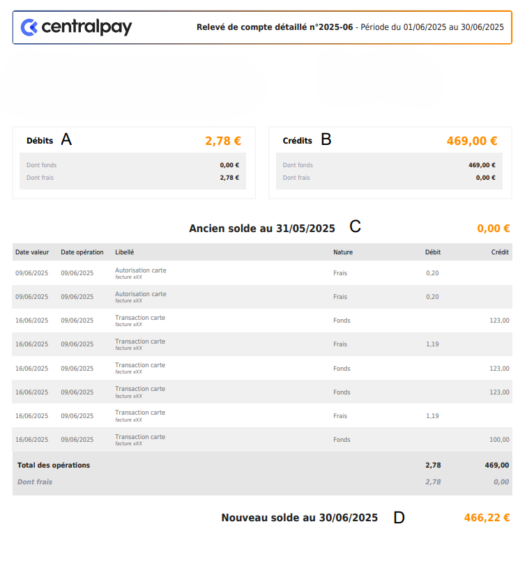 Exports comptables Vous pouvez réaliser plusieurs exports de votre compte aux formats CSV, EXCEL, ou JSON depuis votre Portail Marchand. Pour cela, paramétrez votre recherche avec les filtres disponibles sur la page de l’export souhaité, cliquez sur « Rechercher » puis « Exporter ». En quelques secondes, vous recevrez le fichier par email et pourrez le télécharger à tout moment depuis votre Portail Marchand Fichiers d’export . 1. Export comptable des opérations du compte Cet export reprend l’ensemble des mouvements financiers débiteurs et créditeurs qui ont été réalisés sur votre compte : autorisations cartes, transactions cartes, transactions SDD, transactions SCT, transfers, payout, frais CentralPay, etc. Vous disposerez du détail de chaque opération afin que vous puissiez le rapprocher facilement à vos factures ou vos dossiers. L’export contient les données suivantes : DénominationSignificationwallet_ididentifiant du comptewallet_namenom du compteowner_namenom de la sociétévalue_datedate de valeur de l’opérationoperation_idréférence Centralpay de l’opérationoperation_datetimedate d’opérationsource_typetype d’opérationsource_idréférence permettant de lier plusieurs opérationsnaturenature de l’opérationdebit_amountmontant des opérations de type « débit »credit_amountmontant des opérations de type « crédit »currencydevise de l’opérationcustom_referenceréférence personnalisée de l’opérationcustom_labelnom personnalisé de l’opérationthird_party_ididentifiant du destinataire de l’opérationthird_party_labelnom du destinataire de l’opérationthird_party_countrypays du destinataire de l’opérationpayout_numbernuméro du payout Accès : Recette Portail Marchand – Opérations Production Portail Marchand – Opérations 2. Télécharger le rapport financier mensuel Chaque début de mois, en plus de la facture, un relevé de compte est généré, puis mis à disposition dans l’espace sécurisé de votre compte ( Mes comptes Relevés de compte ). Il présente les montants totaux de crédit et de débit réalisés, incluant un détail « dont fonds » et « dont frais » afin de distinguer la nature. Nous vous proposons deux types de relevés : détaillé ou synthétique. - Le relevé détaillé fait apparaitre l'ensemble des opérations de la période sélectionnée.⚠️ Si vous possédez un grand nombre d'opérations, il est possible que celles-ci n'apparaissent pas sur le relevé. Dans ce cas, nous vous conseillons de réaliser un export au format CSV, Excel ou JSON.- Le relevé synthétique regroupe vos opérations par jour et par type d'opération, pour la période sélectionnée. Pour bien comprendre votre relevé de compte détaillé :A) Le total du montant des débits sur votre compte pour la période donnée :– dont fonds : ensemble des débits de nature « fond » (versements sortants, etc.)– dont frais : ensemble des débits de nature « frais » (frais CentralPay, etc.)B) Le total du montant des crédits sur votre compte pour la période donnée :– dont fonds : ensemble des encaissements sur votre compte (= chiffre d’affaires).– dont frais : ensemble des opérations pour compenser des opérations ou ajuster des frais (remboursement de frais, etc.).C) Solde de clôture du mois précédent le relevé.D) Solde de clôture du mois du relevé téléchargé. Accès : Recette Portail Marchand – Documents Production Portail Marchand – Documents